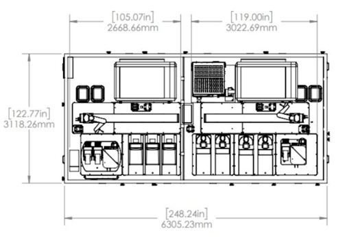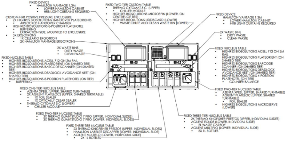Figure 1. HighRes Automated Bioanalytical Testing System. The dimensions are only 10' x 20' x 7.8' (w x l x h). This design prioritizes maximizing throughput and walkaway time while minimizing the physical footprint required to achieve the system's objectives.