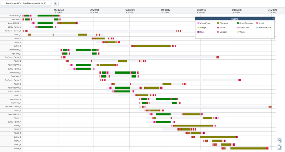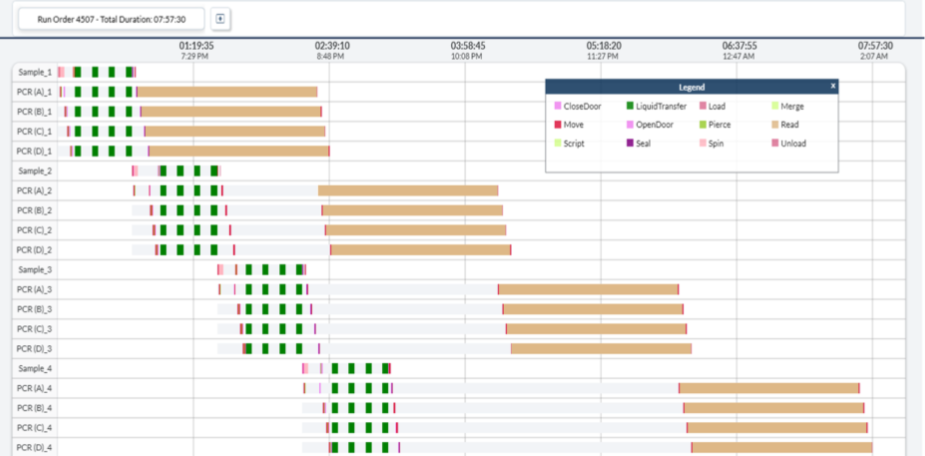 Figure 8. Simulated Gantt Chart for qPCR in the End-to-End Molecular Work Cells