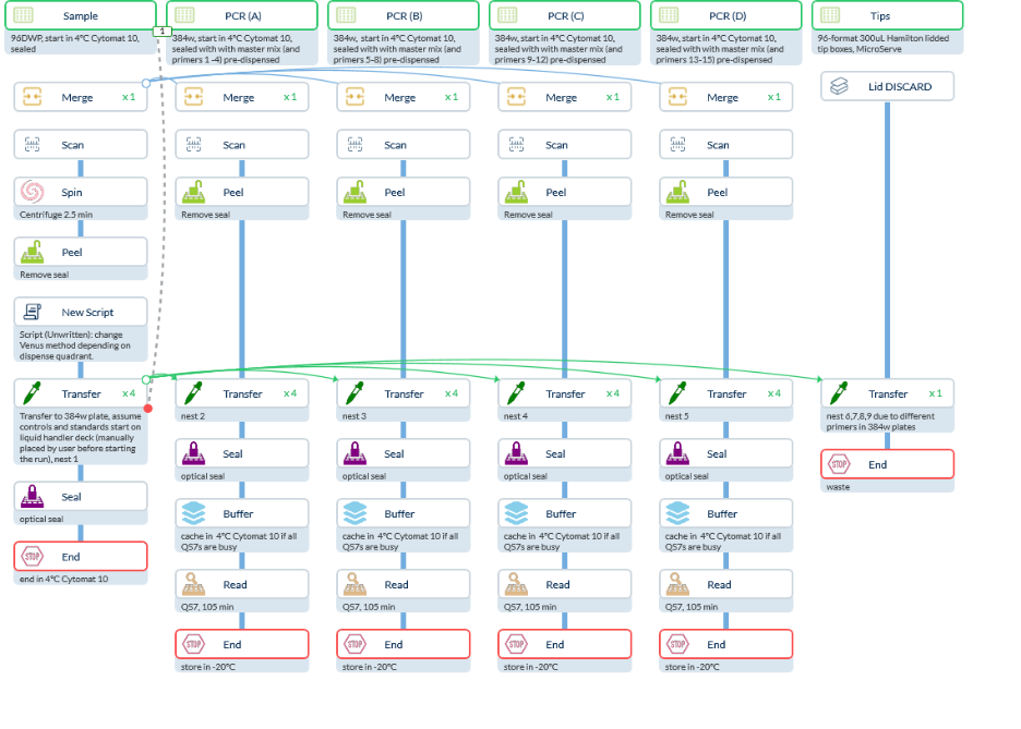 This design includes built-in resilience: if a qPCR device experiences downtime, prepared PCR plates can be temporarily stored in the automated fridge until capacity becomes available. Meanwhile, source plates with remaining purified samples are sealed and returned to refrigerated storage.